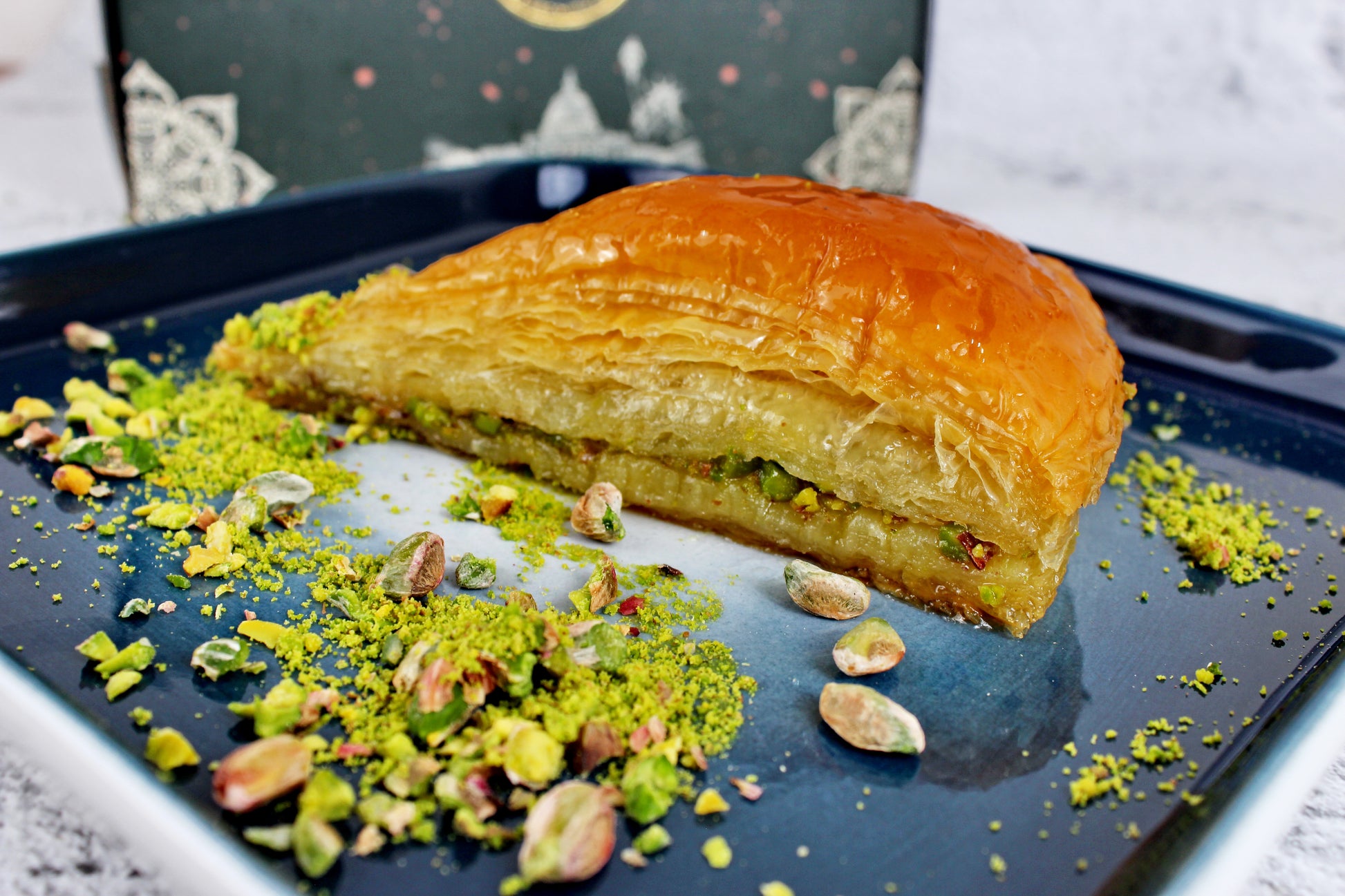 Pistachio Carrot Slice Baklava is a unique and innovative twist on the classic baklava, combining the rich flavors of pistachios with the subtle sweetness of carrots. This dessert features layers of thin, flaky phyllo dough, meticulously layered and filled with a mixture of finely ground pistachios and grated carrots. The filling is sweetened to perfection, creating a harmonious blend of nutty and earthy flavors. Each layer is brushed with clarified butter, ensuring a golden, crispy texture. Once baked, the baklava is soaked in a light syrup, allowing it to absorb the sweetness and become irresistibly moist. Garnished with a sprinkle of crushed pistachios, this Pistachio Carrot Slice Baklava is a delightful and unexpected treat that will captivate your taste buds.
